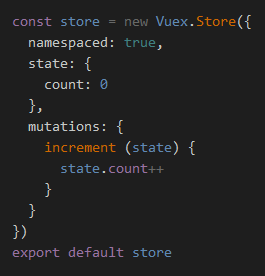 const store = new Vuex.Store({ state: { count: 0 }, mutations: { increment (state) { state.count++ } } }) export default store